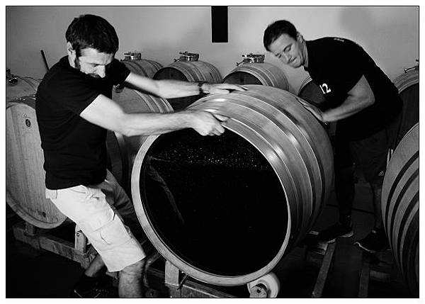 小桶發酵的特點在於葡萄的皮與汁在桶中充分混合,只需每天轉動幾次平躺的木桶,不需要再透過踩皮與淋汁來萃取葡萄皮中的單寧和色素就能有極佳的浸皮效果。無須幫浦,也不用實際接觸,葡萄被輕柔對待,不會萃取過度,單寧質地較細膩,澀味也較柔和。在轉桶的過程中,也會讓死酵母加速水解產生甘油,讓酒喝起來更圓潤,在新釀成數月間就可以相當可口。
