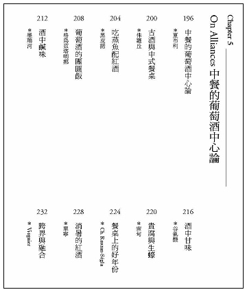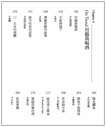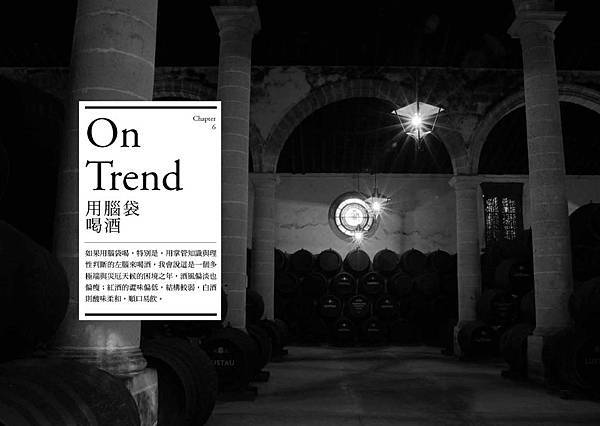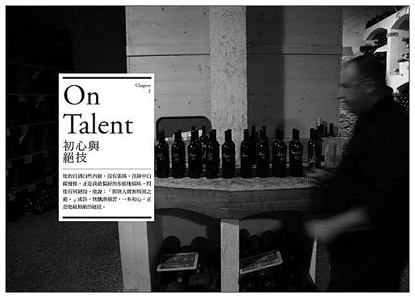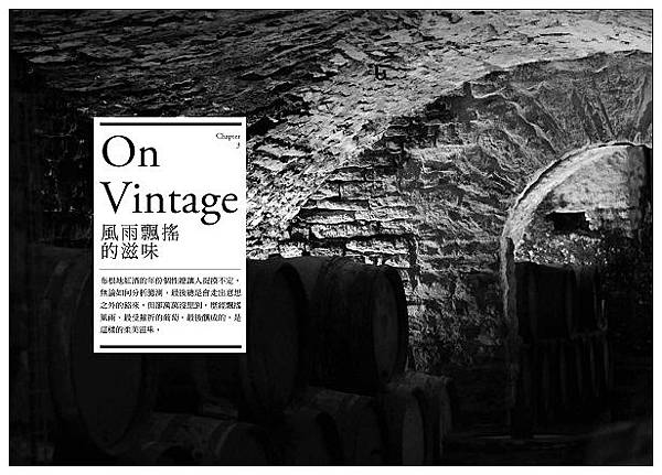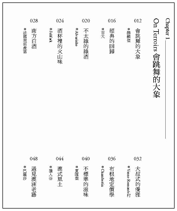 如同 « 會跳舞的大象 »,這本書裡的其他六十二篇關於葡萄酒的短篇文章,主要選自過去兩年半,為商業週刊Alive所寫的專欄小文,每一篇都隨著時間演進改寫成新的版本,再一一地編進分別談論風土(on Terroir)、釀酒天份(on Talent)、品種(on Vine)、年分(on Vintage)、餐酒聯姻(on Alliance)和潮流(on Trend)這六個環繞著葡萄酒的章節之中。
